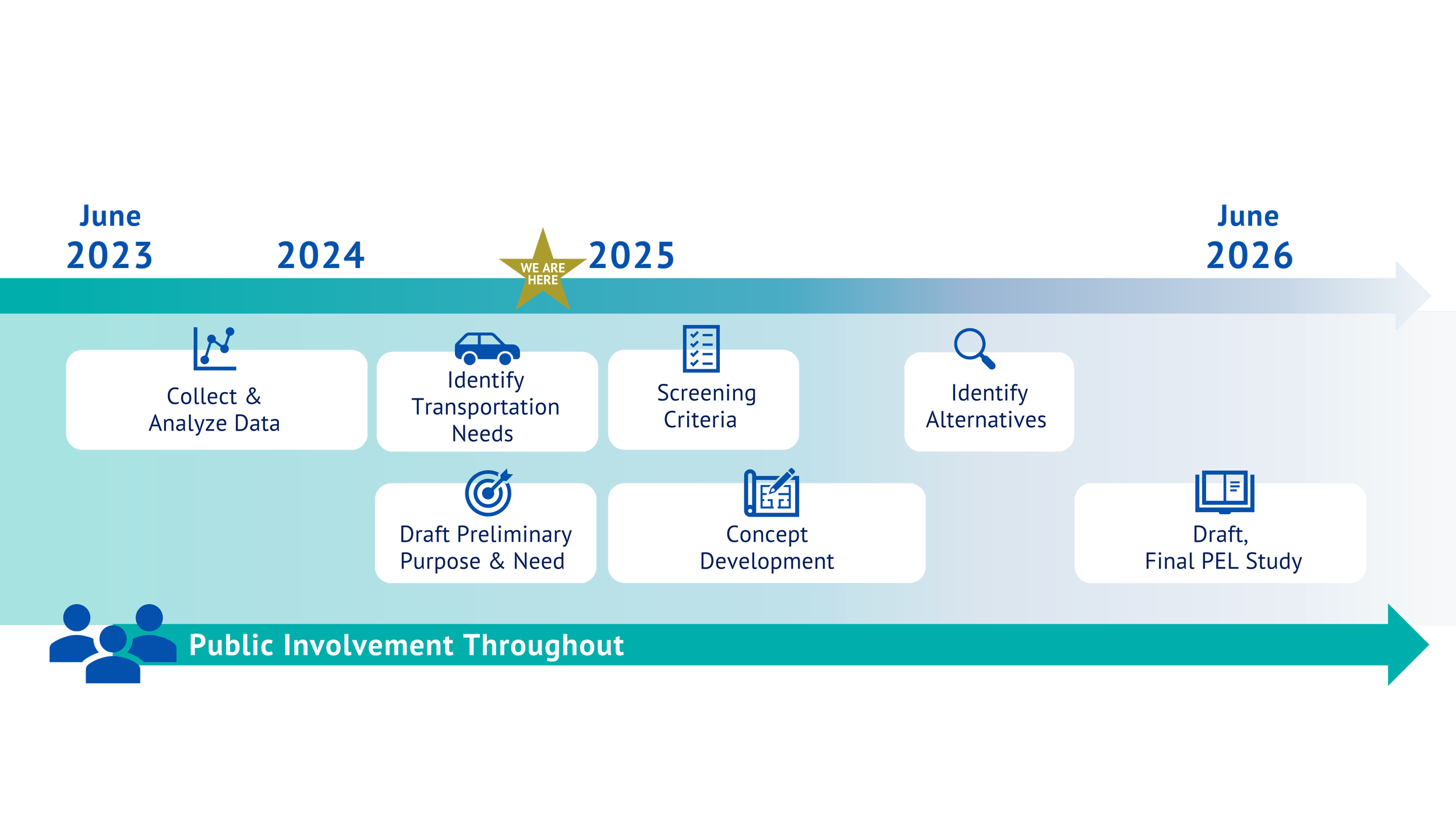 The study began in June 2023 and will last through June 2026. The study team is currently in the concept development phase. Public involvement is occuring throughout the study.